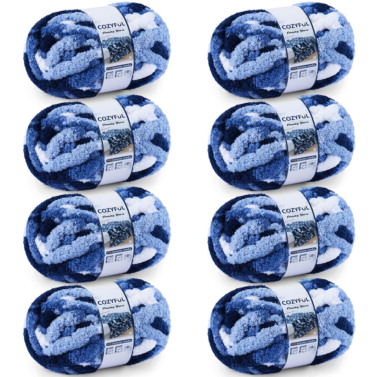 Cozyful Chunky Yarn for Hand Knitting - #10 Chunky Chenille Blanket Yarn, Jumbo Big Thick Chunky Yarns for Crocheting, Tie Dye Bulky Knit Yarns, 8 Skein (25 yds 8 oz Each Skein), Multi Blue & White