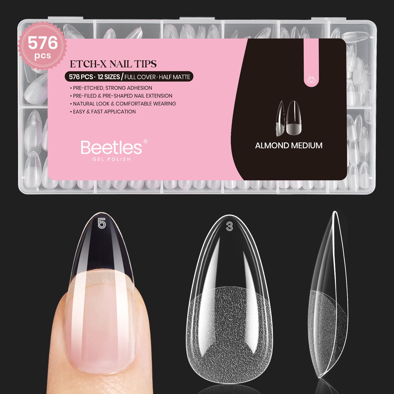 - 【No Shaping Needed】: Beetles etch-X medium almond nail tips choose inner half matte texture, with stronger friction, better fitting your natural nails. You can stick the full cover almond nail tips with nail glue directly, enjoy the privilege of "NO NEED TO FILE". Also,the glue on nails is pre-shaped,saving time and effort.No worries that your nails will become thinner due to polishing, providing better care for your nails.