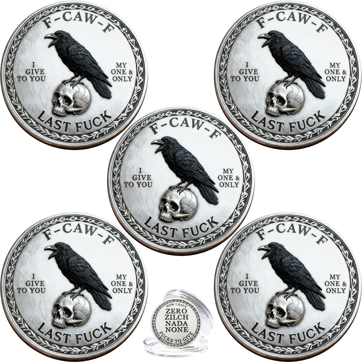 The F-CAW-F Coin — for Those Who Laugh at Life and Give Zero F*CKS, Fuck to Give Challenge Coin, Funny Double-Sided Commemorative Coin with Raven Skull Design, Gift for Friends (5PCS)