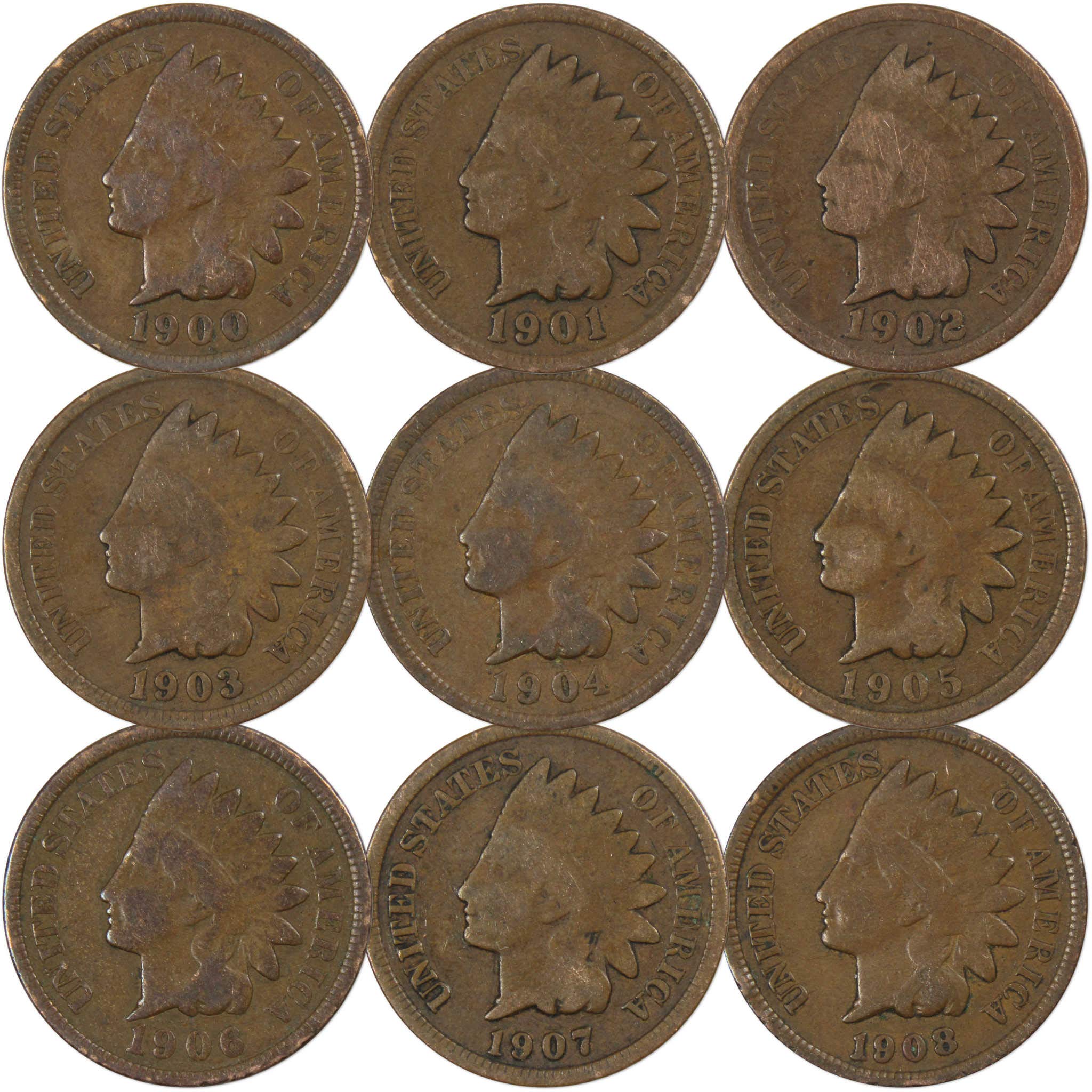 - DETAILS: This 9 coin set contains consecutively dated Indian Head cents from 1900-1908. Over 100 years old, these coins were struck in Philadelphia during the series' final decade, and feature Liberty in a headdress, honoring our Native American heritage