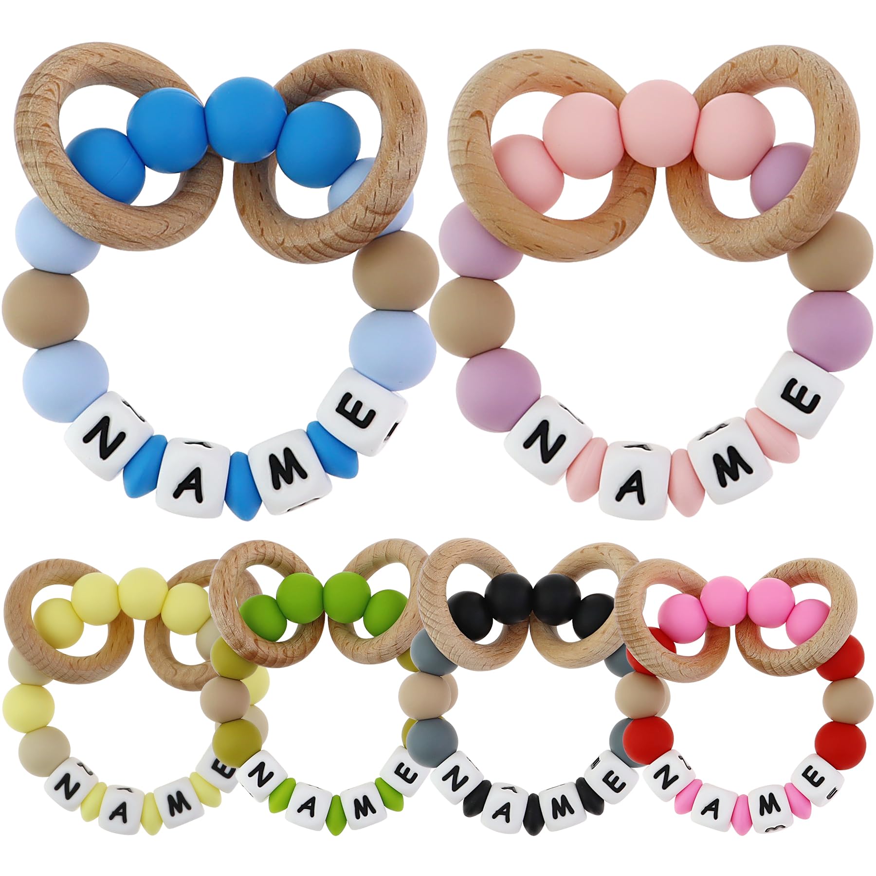 Personalized Baby Gift-Teether Ring With Name,Custom Teether Rattle For Boys Girls, Silicon Teething Wooden Ring