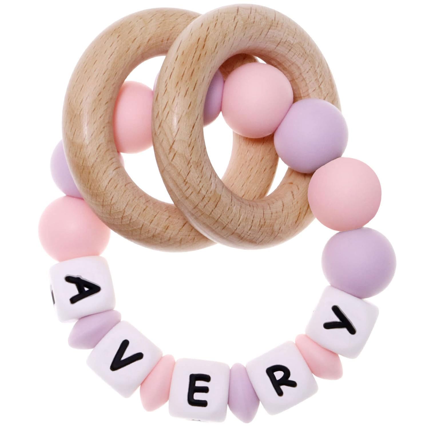 Munchewy Presonalized Teether with Name Baby Rattle Teether Ring, Customizable Silicone Sensory Chew Bracelet with Natural Organic Beech Wood Teething Rings for Girls Baby Shower Toys(Pink/Lilac)