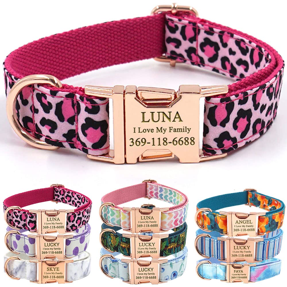 PETDURO Personalized Dog Collar Pink Leopard Print with Name & Phone Engraved on Rose Gold Metal Buckle for Large Medium Boy