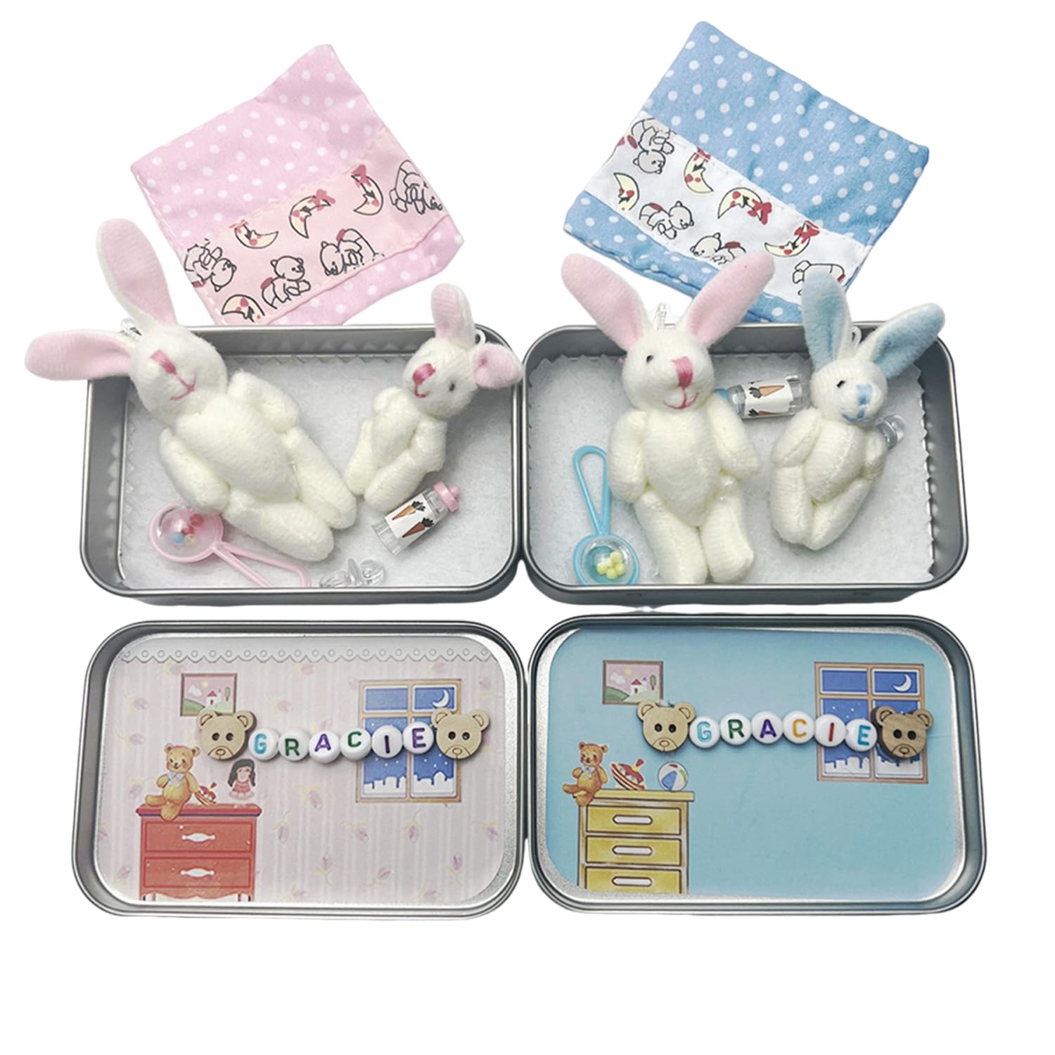 - Each tin includes two plush bunnies, one large and one small, who will be cosy on a felt mattress covered in polka dot floral quilt pockets, and to add to the cuteness each tin comes with a mini rattle with a pacifier and bottle to adorn the tiny baby bunnies