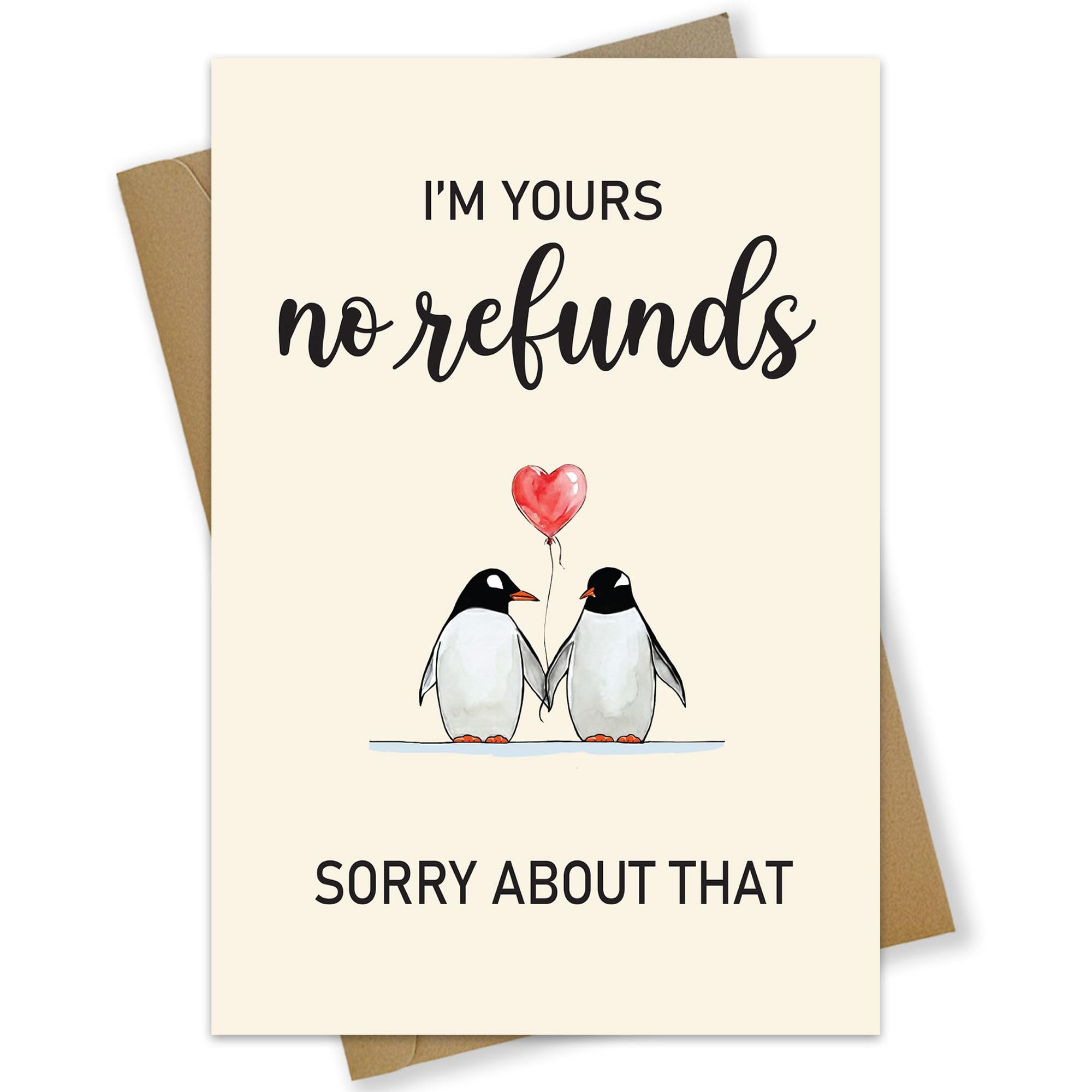 Funny Valentine’s Day Card for Him or Her, “I’m Yours No Refunds” Penguin Love Card, Valentine's Day Gift for Her, Anniversary Card for Husband Wife Boyfriend Girlfriend, LGBTQ+ Gift, Blank Inside with Envelope