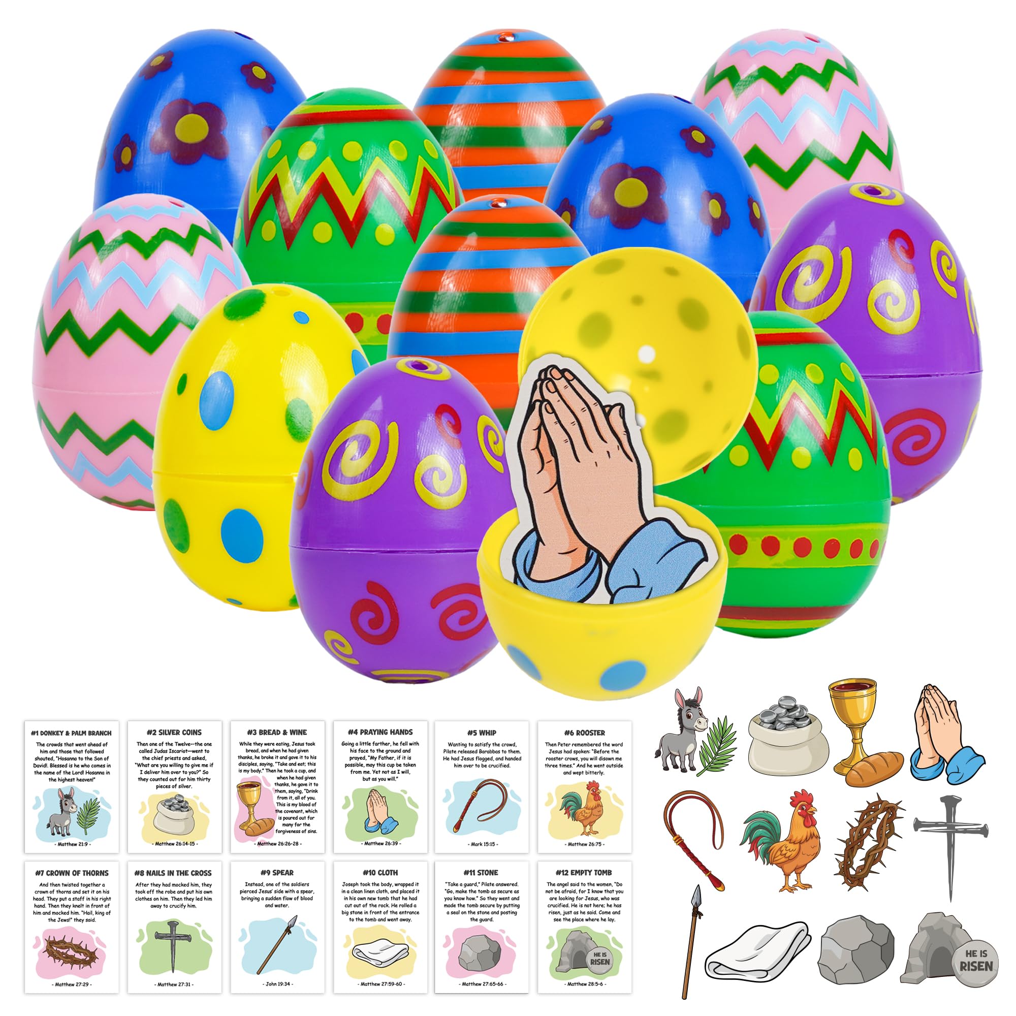 - Engaging Easter Storytelling: This set includes 12 Resurrection Easter eggs and 12 matching story cards, each depicting a vivid part of the Easter story. Perfect for kids to engage with the Christian Easter story in a fun, educational way.