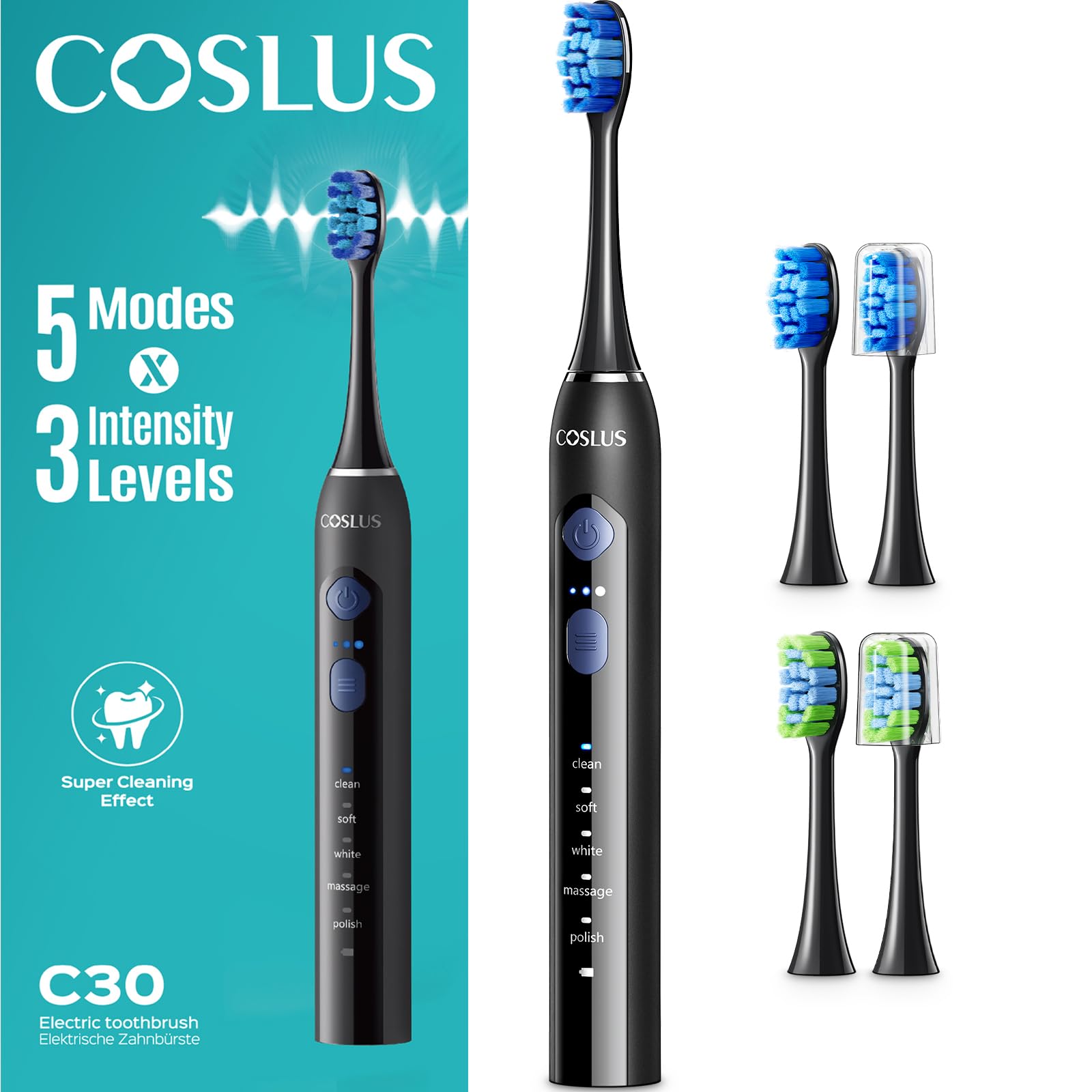 COSLUS Sonic Electric Toothbrush for Adults: 3 Intensities & 5 Modes Customized for Effective Yet Gentle Cleaning - 2 Types o