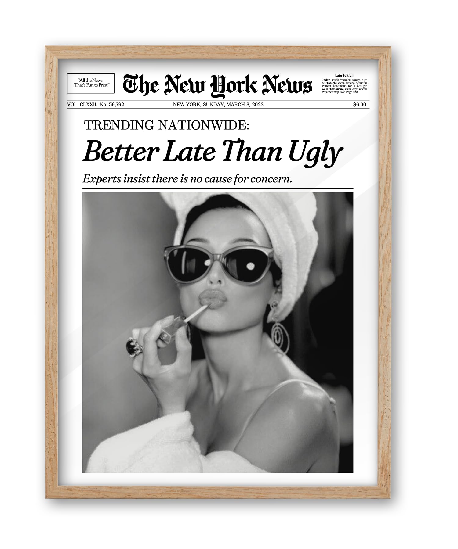 - Audrey Hepburn “Better Late Than Ugly” Design – Features a vintage newspaper-inspired print with the iconic Audrey Hepburn quote, "Better Late Than Ugly," adding a touch of elegance and humor to your space