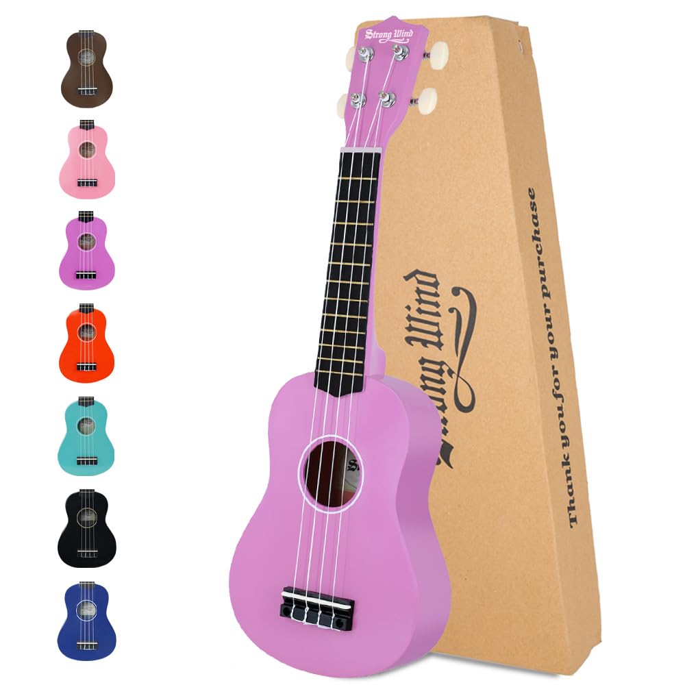 - ????Remium Basswood Body: Real basswood body with a high gloss finish creates clear, crisp and melodious sound. The fretboard are smooth and do no harm to your fingers. This mini cute ukulele has 12 frets on the fingerboard, producing different tones for a song. Strong Wind 21 inch soprano ukulele starter set is the best musical instrument present for friends who want to play music.