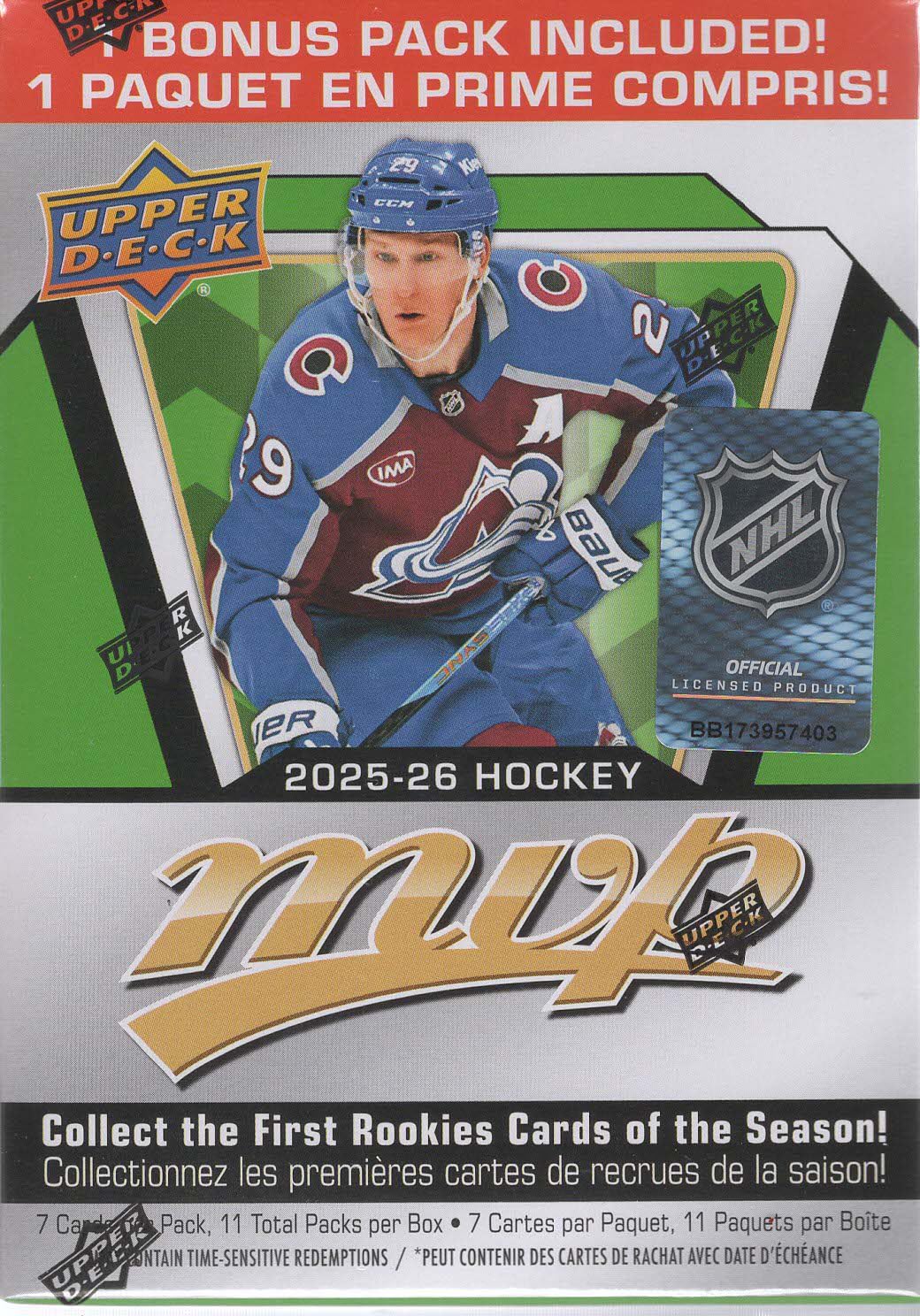 - This is a brand new factory sealed 2025 / 2026 Upper Deck MVP NHL Hockey Series Blaster Box that contains 11 packs (10 packs with 7 cards per pack plus plus 1 bonus pack with 3 Gold Script cards) for a total of 73 cards per box!