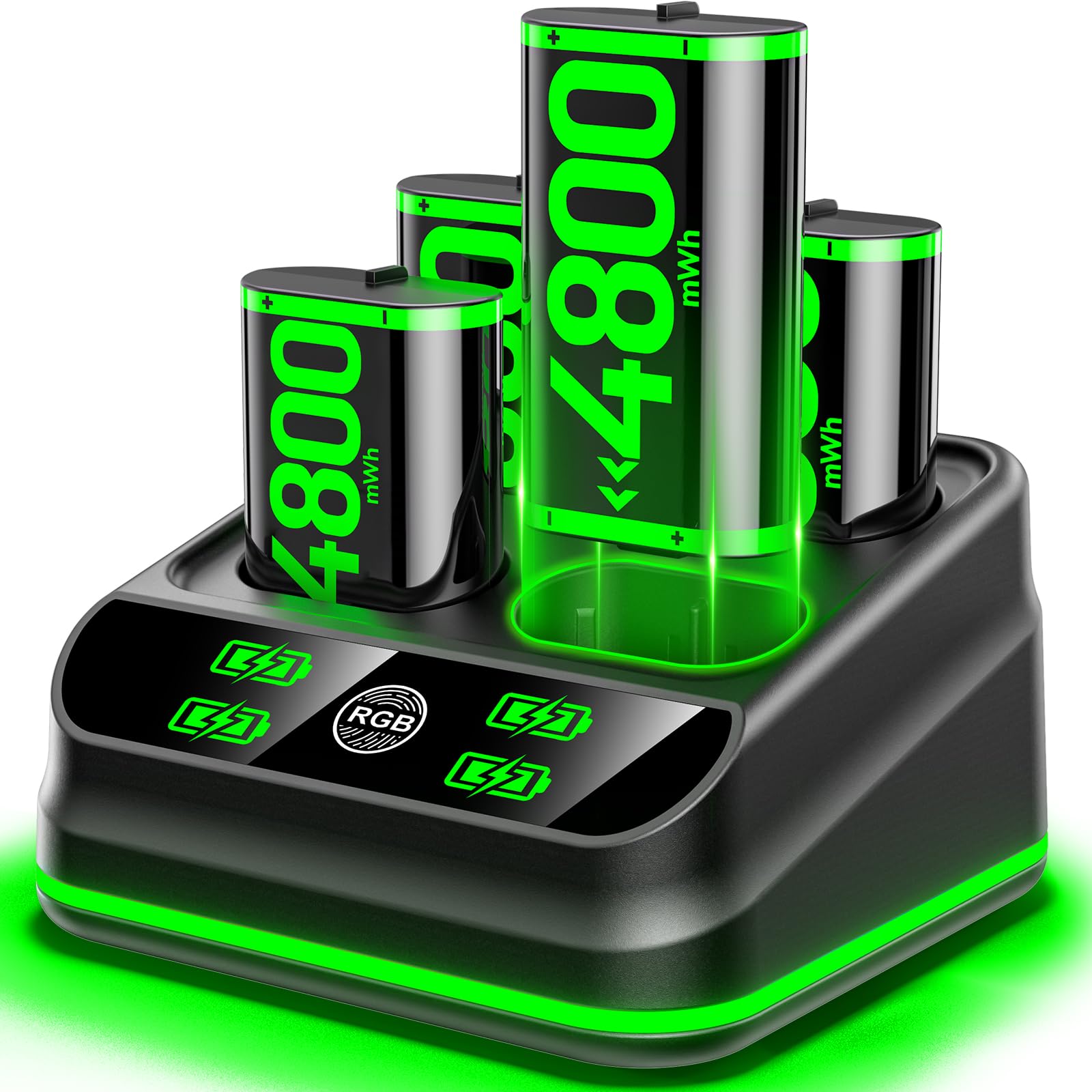 - [ 4 X 4800mWh Xbox Batteries with Charger] Rysker Xbox rechargeable battery pack comes with four high-capacity rechargeable Xbox batteries charger station for Xbox Series X|S/Xbox One/Xbox One S /Xbox One X/Elite/Core controller, it can be charged easily anywhere with 26ft USB cable. Xbox series x batteries can be recycled up to 3000 times, and it’s a great replacement to buying AA batteries constantly.